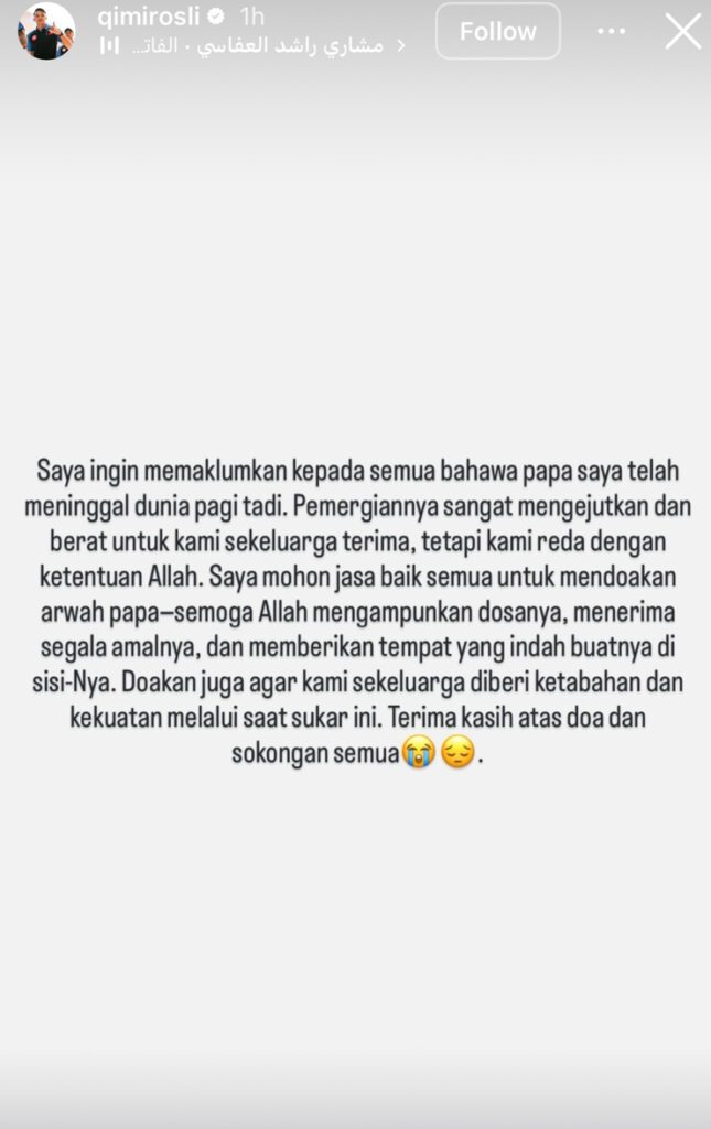 Menurut Haqimi, pemergian insan tersayang itu amat mengejutkan dan sukar untuk diterima oleh seluruh ahli keluarga. Dalam luahannya, jelas terpancar kesedihan kehilangan seorang figura bapa yang banyak berjasa dalam hidupnya.