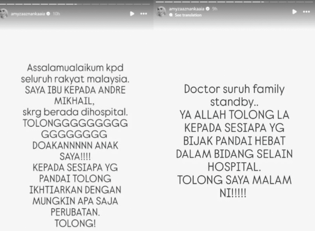 Teruskan MembacaMenurut Amyza, keputusan itu dibuat selepas pihak doktor meminta ahli keluarga bersedia dengan sebarang kemungkinan. Walaupun berdepan detik sukar, Amyza mengakui dia masih menyimpan harapan dan hanya mampu berdoa agar satu keajaiban berlaku buat anaknya.