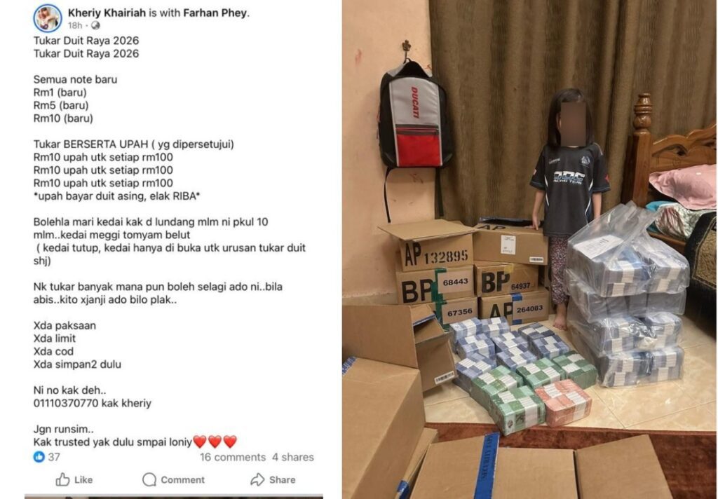 Melalui hantaran Facebook yang tular itu, seorang individu dilihat menawarkan servis tukar duit raya bagi tahun 2026 dengan menyediakan wang kertas baharu RM1, RM5 dan RM10.