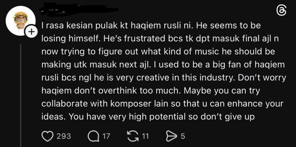 Perkara itu mula hangat diperkatakan di Threads, apabila seorang pengguna meluahkan pandangan mengenai perubahan yang dilihat pada penyanyi tersebut, sambil menyifatkan Haqiem sebagai antara artis berbakat besar yang wajar terus diberi perhatian.